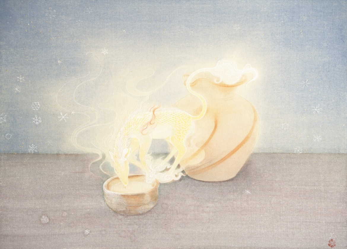 大きさ:242×333mm 基底材:絹 素材 :雲母胡粉、天然岩絵具、植物染料、金箔 2025年制作